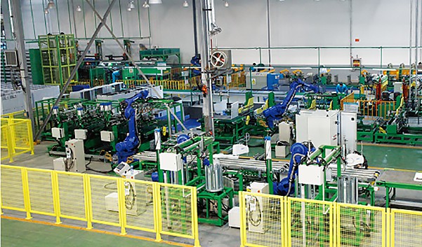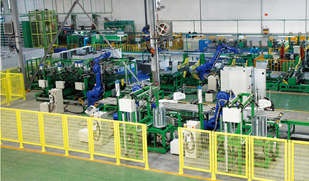 鉸鏈加強鐵鉚接段功能:同時兼容雙鉸鏈/四鉸鏈加強鐵TOX鉚接,自動補給、自動鉚接。該段包含加強鐵堆垛機、機器人取料機、加強鐵定位 及鉚接段、TOX鉚接槍和鉚接機器人等組成。